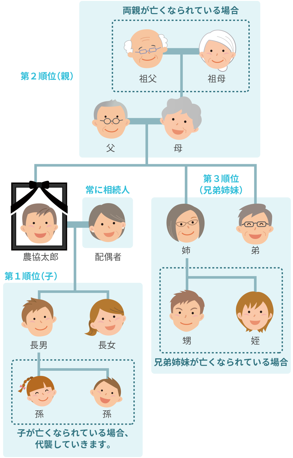 第三順位 | 兄弟姉妹 | 第一順位、第二順位の相続人がいない場合に限り相続人となります。 |