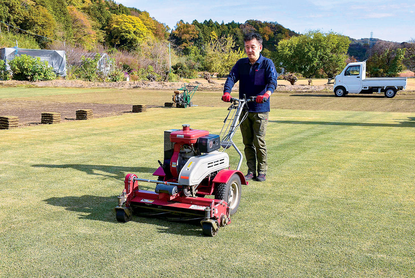 育成を良くし、芝を鮮やかな緑色にするために欠かせない施肥は、定期的に実施。虫が発生しやすい夏季には、薬剤散布で防除を行うほか、大きな雑草は手作業で抜き取るなど、管理作業には時間と手間をかけています。 この他、季節に合わせ、芝刈りの頻度や切り取りの厚さを調整することで、高品質な芝の出荷につなげています。