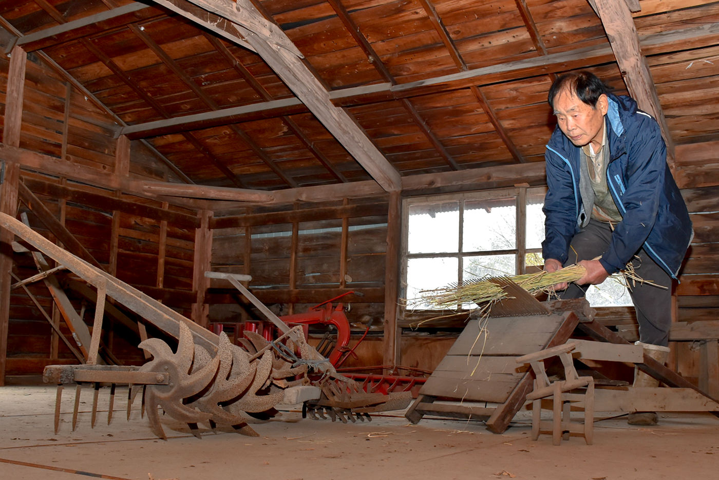 就農してからの約70年間、養蚕、酪農、水稲・野菜の生産と、さまざまな経験を積んできました。時代とともに変化していった農具は、貴重な資料として大切に保管しており、今でも黒米の脱穀には「千歯扱き」を使用しています。
