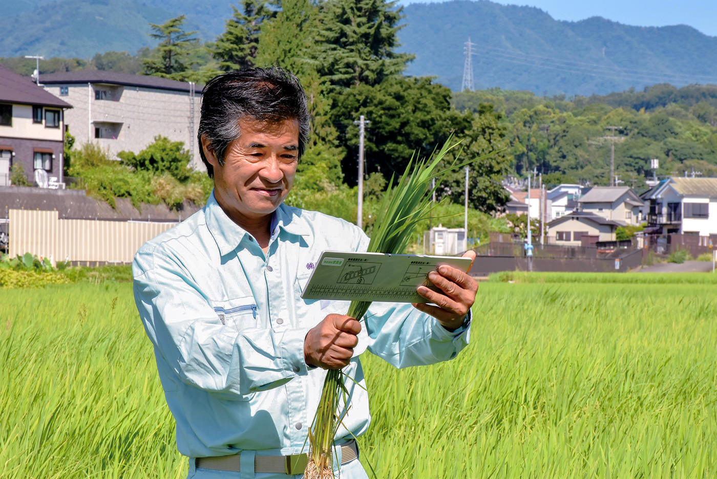 「米の品質向上には、観察に基づいた管理が欠かせない」と話す難波さん。水稲の葉色による施肥量の調節や、水田の水はけの違いで水管理のタイミングを変えるなど、圃場ごとに細やかな調整を行い、良質・良食味米の生産につなげています。