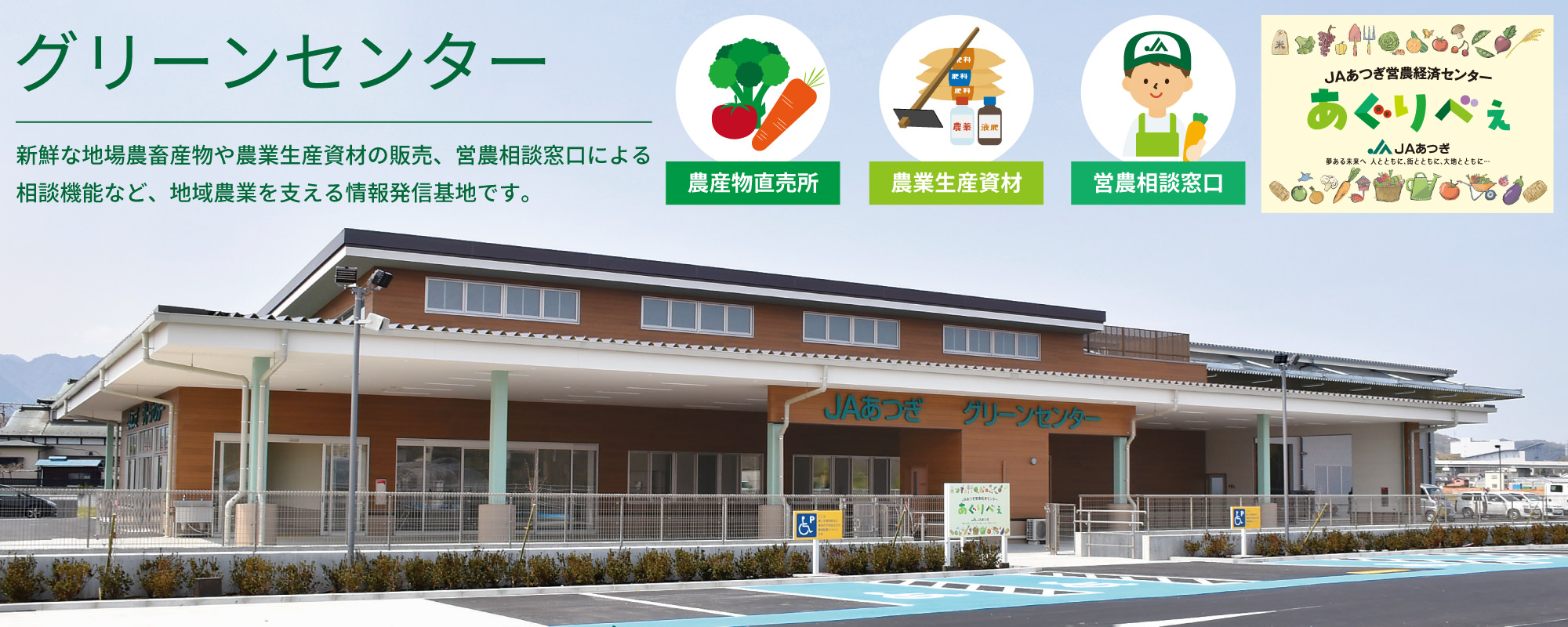 営農経済センターの愛称「あぐりべぇ」は、「アグリカルチャーベース」と方言の「べぇ」を合わせた造語。グリーンセンターは、農畜産物や生産資材の供給起点として重要な役割を担います。
