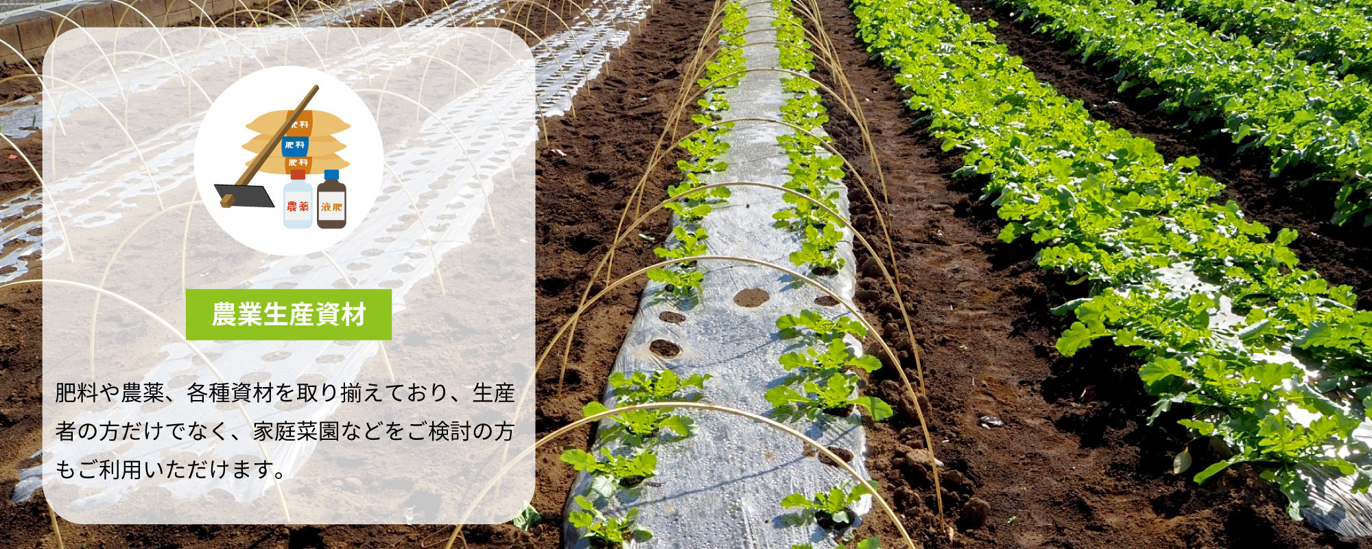 肥料や農薬、各種資材のほか、長靴などの服飾雑貨も取り扱っています。生産者向けはもちろん、家庭菜園用の商品なども多数取りそろえています。