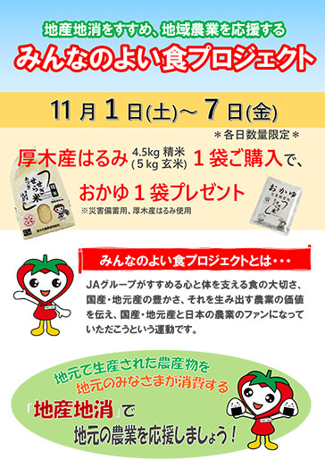 JAあつぎでは、「よい食」をキーワードに、さまざまな取り組みを進めています。今回は厚木産はるみ4.5kg精米(5kg玄米)1袋をご購入で、災害備蓄用おかゆ1袋をプレゼントする「厚木産米はるみ特別販売キャンペーン」を行います。