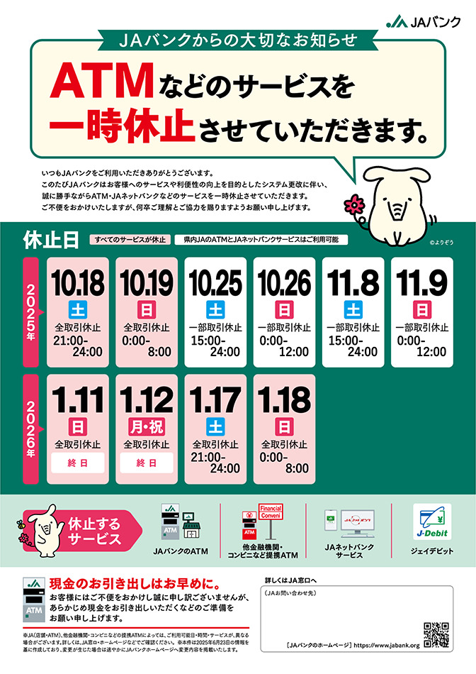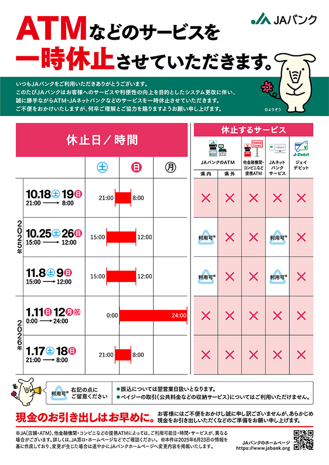 システム更改に伴うATM・JAネットバンク等サービス一時休止について