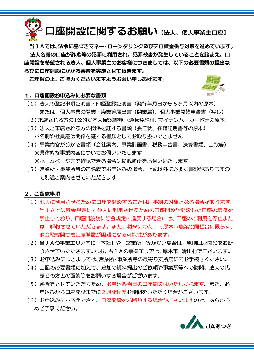 法人名義の口座が詐欺等の犯罪に利用され、犯罪被害が発生していることを踏まえ、口座開設を希望される法人、個人事業主のお客様につきましては、必要書類の提出ならびに口座開設にかかる審査を実施させていただいております。ご理解の上、ご協力いただきますようお願い申しあげます。