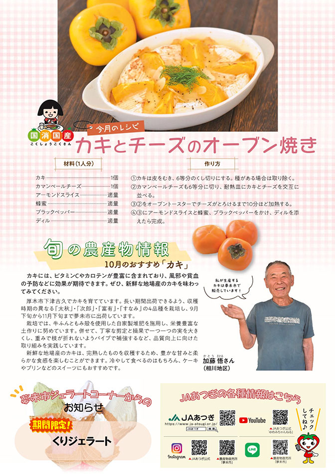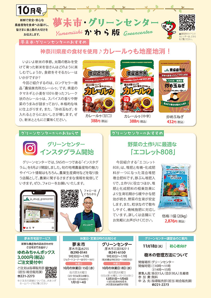 夢未市・グリーンセンターかわら版 10月号 更新日:2025.10.f1 JAあつぎ農産物直売所の最新情報が満載の「夢未市・グリーンセンターかわら版」10月号をお届けします! 季節のおすすめ商品や、最盛期を迎える農畜産物、オリジナルレシピなど、旬の情報が盛りだくさん♪ぜひご覧ください! PDFはこちら 関連リンク 夢未市についてはこちら グリーンセンターについてはこちら
