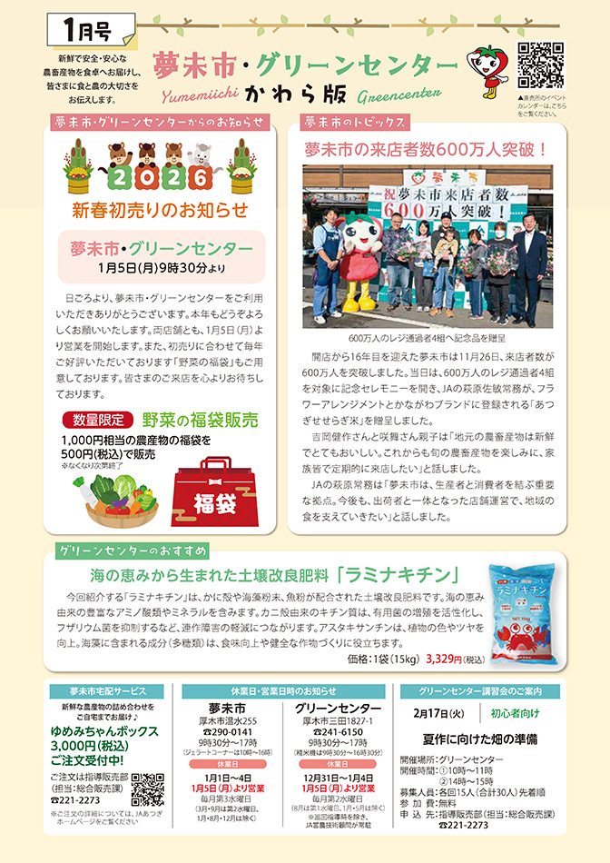 JAあつぎ農産物直売所の最新情報が満載の「夢未市・グリーンセンターかわら版」1月号をお届けします!