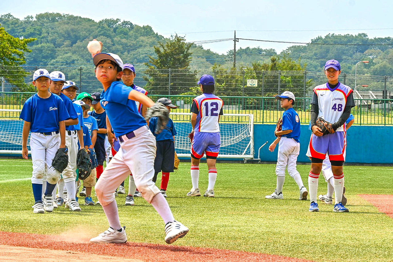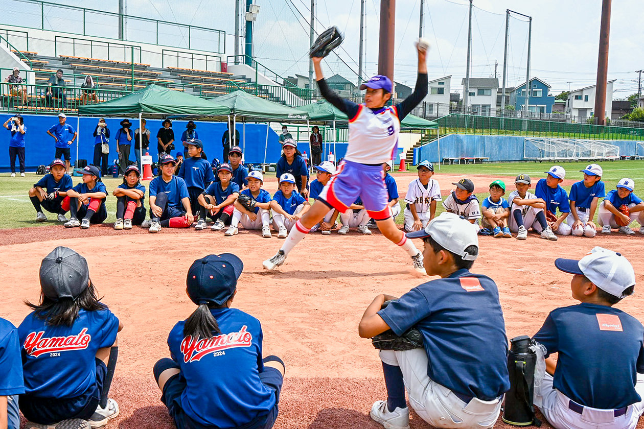 当日は43人が参加。全国大会出場常連の強豪校である県立厚木王子高等学校ソフトボール部の監督・部員が講師を務め、守備の方法や投球フォームなどを丁寧に指導しました。