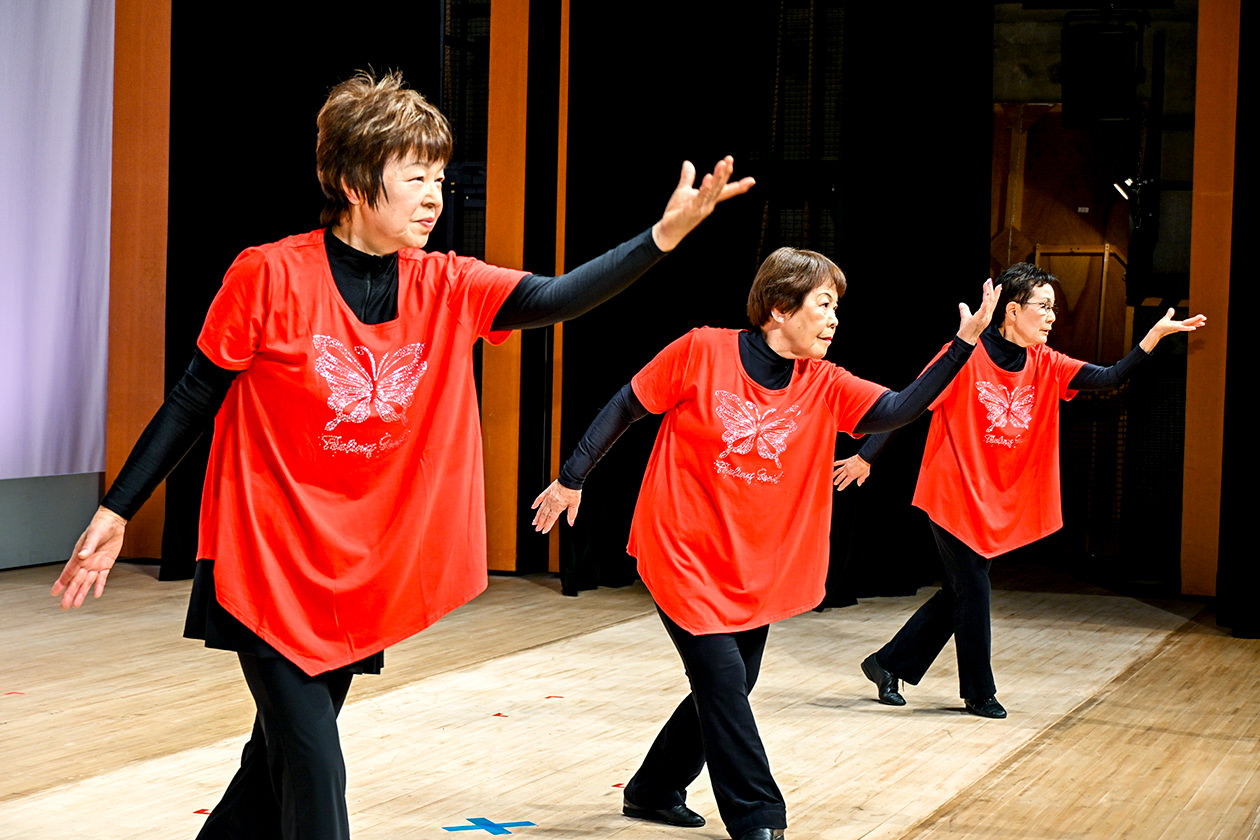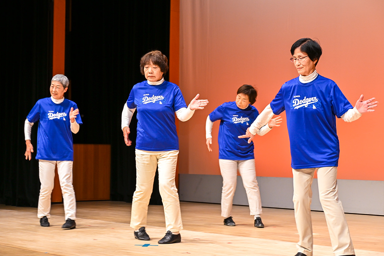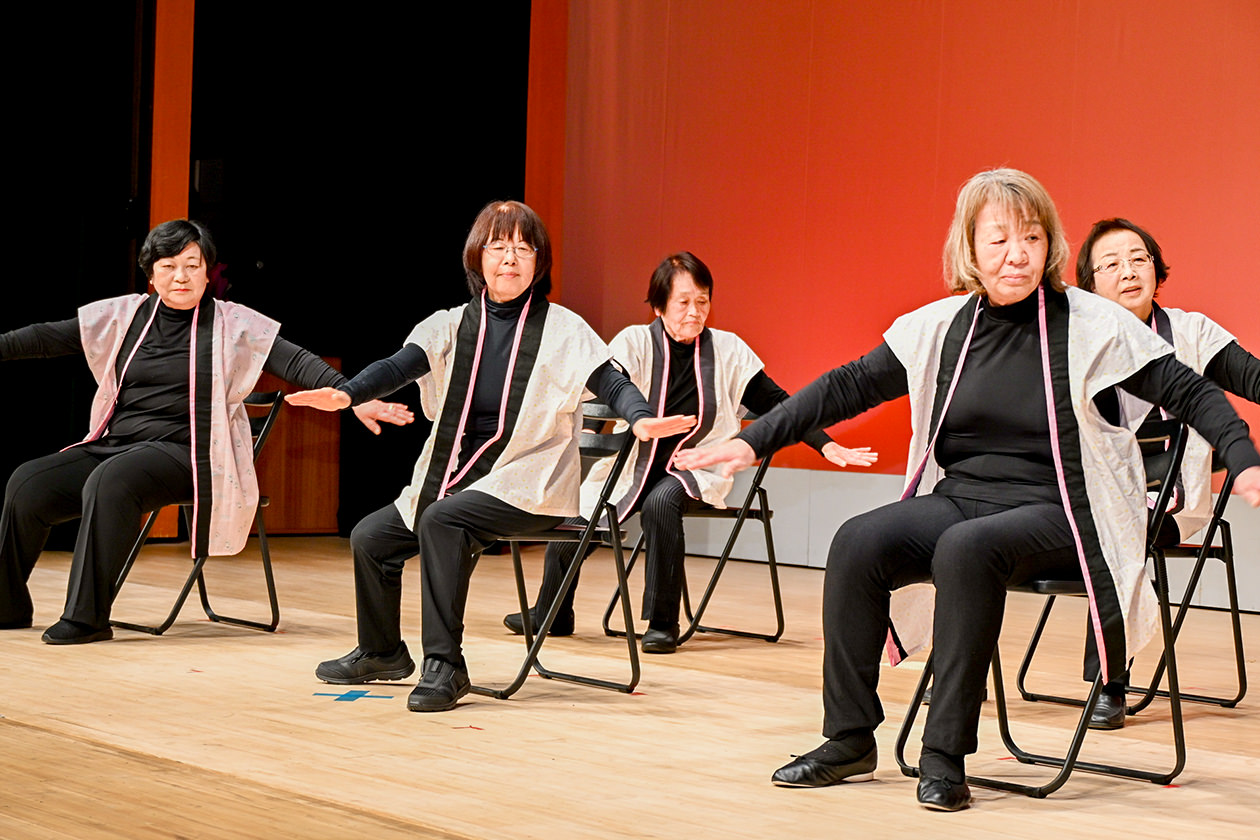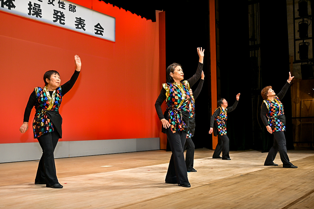 当日は、各地区から13グループ延べ65人が参加し、そろいの衣装を身にまとって体操を披露。演歌やアップテンポな曲など、さまざまな曲調に合わせた動きと華麗なポーズで会場を大いに盛り上げました。
