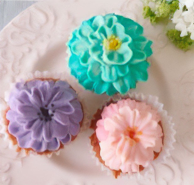 - 「あんフラワー」とは、カラフルな白あんを絞り出してお花にしたものです。講師が焼いたカップケーキに素敵な花を咲かせます。※ご自分の分を作ってお持ち帰りいただきます