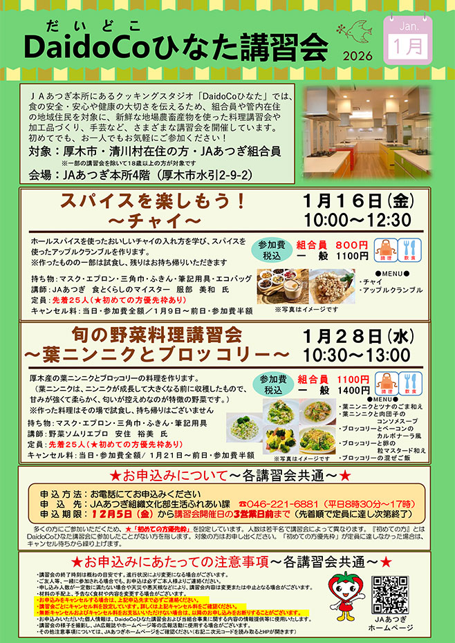 JAあつぎ本所4階にあるクッキングスタジオ「DaidoCoひなた」では、食の安全・安心や健康の大切さを伝えるため、組合員や管内在住の地域住民を対象に、新鮮な地場農畜産物を使った料理講習会や加工品づくり、手芸など、さまざまな講習会を開催しています。