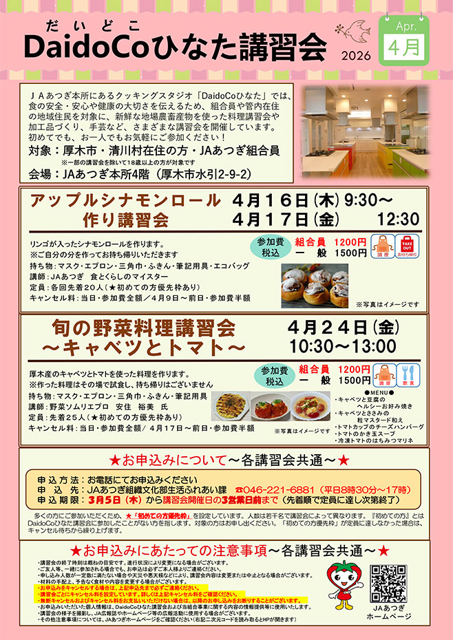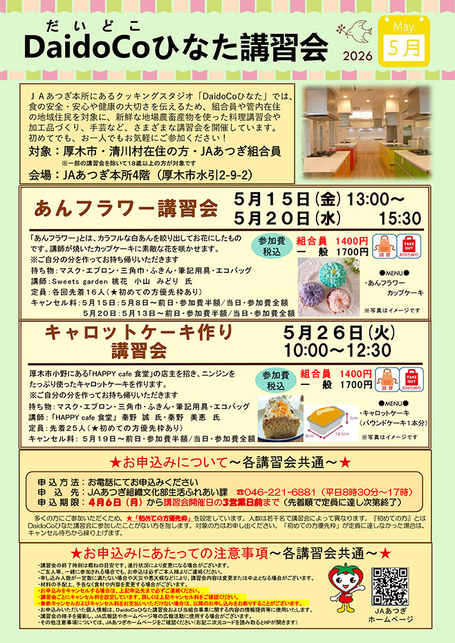 - キャンセル料のお支払いは、講習会開催日から10日以内(土日祝日を含む)にJAあつぎ本所の組織文化部(担当:生活ふれあい課)までご持参ください。
