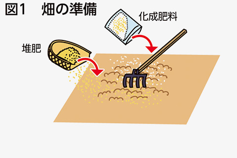 植え付け2週間前に1平方m当たり苦土石灰200gを全面にまいて、よく耕しておきます。植え付け溝は畝幅120cmとし、幅20cm、深さ20cmに掘り下げます。元肥は溝1m当たり堆肥を2kg、化成肥料(NPK各成分10%)100g程度を施し、土を戻します(図2)。