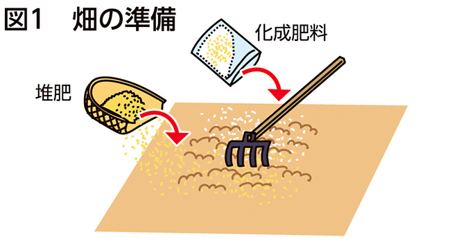 種まきまたは植え付け2週間前までに、1平方m当たり苦土石灰100gを菜園全体に散布し耕しておきます。1週間前までに堆肥1kgと化成肥料(NPK各成分10%)100gを全面に施し、土とよく混ぜておきます(図1)。ルッコラは野生に近く肥料が多いと香りが弱くなりがちです。