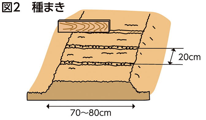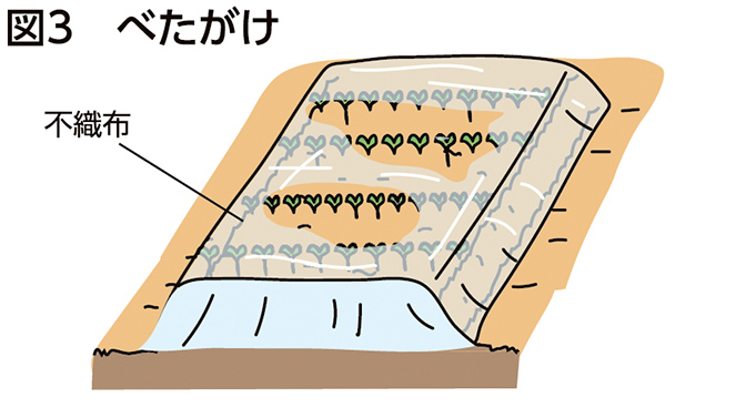 幅70~80cm、高さ5~10cmのベッドを作ります。次に、板切れなどで直角方向に幅20cm間隔の浅い種まき溝を作り、この溝に約1cm間隔に筋まきします(図2)。種は小さいので、種が隠れる程度(5~6mm)に薄く覆土します。不織布のべたがけで幼苗を保護しましょう(図3)。7~10日間隔にまき日をずらせば、長い間収穫を楽しめます。なお、苗作りをする場合は、128穴のセルトレーに1セル4~5粒を種まきし、発芽後は間引きして本葉約3枚の植え付け苗に仕上げます。苗は5~6cm間隔に植え付けます。
