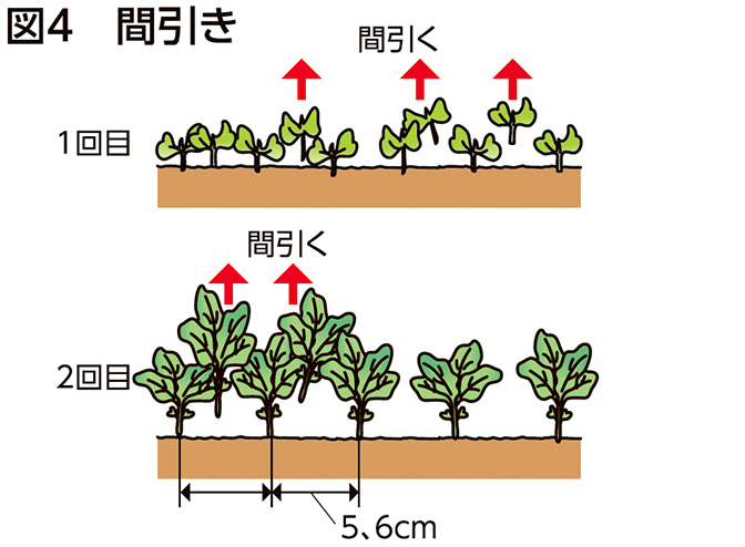 1回目は発芽後、葉が重ならない程度に順次間引き、2回目は本葉約2枚のときに5~6cmくらいにします(図4)。畑が乾燥すると葉が堅くなりやすいので、適宜かん水します。
