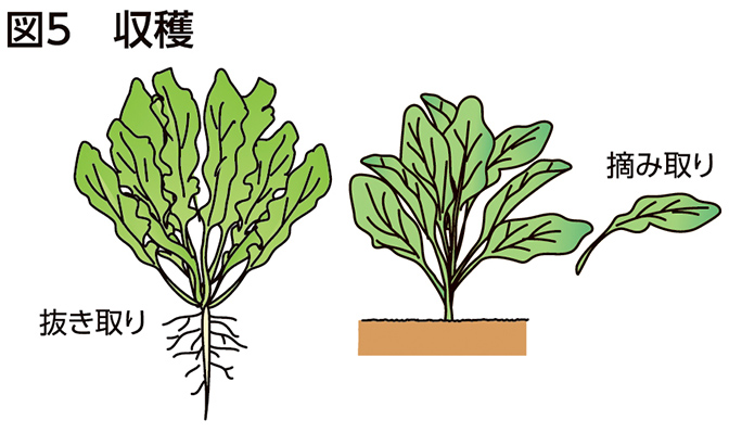 葉が柔らかいうちの若取りが良く、葉の長さが20~25cmのときが収穫適期で、株ごと抜き取ります(図5)。なお、外葉から1枚ずつ摘み取れば、長い間収穫を楽しめます。