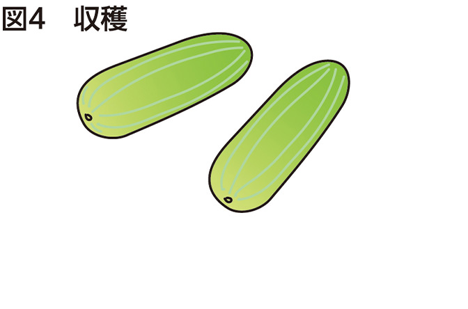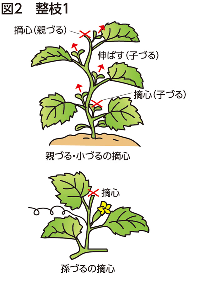 シロウリは孫づるに着果する性質があるため、摘心して孫づるを多く出させます。まず、親づるは本葉5~6枚でつる先を摘み、上の節から出る子づるを4本伸ばします。その後、子づるを8~10節で摘み、それぞれの孫づるは2葉を残して摘心します(図2)。つるは左右に振り分けて重ならないように配置します(図3)。つるが伸びていく場所に、つるが絡むためのわらを敷きます。