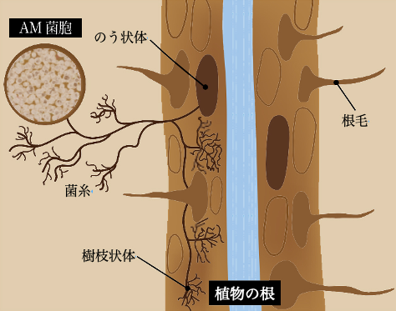 アーバスキュラー菌根菌(以後AM菌)は、代表的な菌根菌の一種で、約3億7千年前から共生していることがシダの化石から推測されています。約5億年前に陸上へ進出した植物はAM菌と共生するシステムを進化させ、土壌中で動きの小さいリン酸の効率的な吸収を可能にしたようです。菌糸を植物の根に深く侵入させ、「樹枝状体」と「のう状体」(図1参照)を形成するのが特徴で、土壌中のリン酸のほかに微量要素のカルシウム、マグネシウム、亜鉛などを吸収して植物へ供給し、植物からはアミノ酸や糖類を譲り受けています。多くの植物と共生していますが、アブラナ科やアカザ科、サトイモ科、水生植物とは共生しにくいようです。