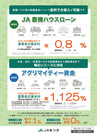 その他ローン JA農機ハウスローン 農機具やハウス等の設備資金にスピーディに対応します。 JA農機ハウスローン商品概要説明書 アグリマイティー資金商品概要説明書 詳細はPDFファイルをご覧ください。 詳しくはこちら(1.1MB) JA空き家解体ローン 居住していない住宅の解体にかかる費用にご利用いただけます。 JA空き家解体ローン商品概要説明書 JA無担保借換住宅ローン 他の金融機関で現在お借り入れ中の住宅ローンのお借り換えを希望される方で、一定範囲内の金額であれば無担保で対応可能です。 JA無担保借換住宅ローン商品概要説明書 JAカードローン 生活に必要なちょっとしたお金。自分に合ったプランを見つけてみませんか。 JAカードローン商品概要説明書 お申し込みはこちら JAフリーローン 旅行資金や結婚資金等、様々な資金にご利用いただけます。 JAフリーローン商品概要説明書 お申し込みはこちら JA多目的ローン お使いみちが確認できれば、金利(保証料)がお得になります。 JA多目的ローン商品概要説明書 お申し込みはこちら JAカード型教育ローン 一枚のカードでいつでも何度でも自由に使えます。 JAカード型教育ローン商品概要説明書 お申し込みはこちら